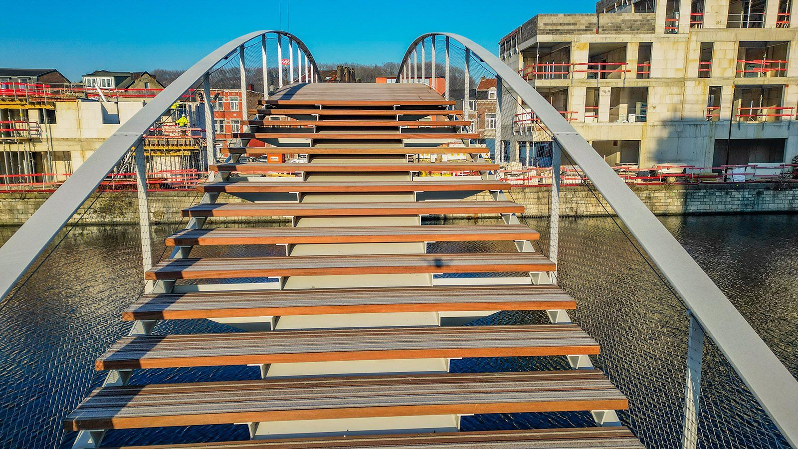 Découvrez les photos qui immortalisent les principales étapes de la pose de la passerelle des Plaisanciers qui crée une liaison essentielle au cœur des espace de vies développés autour de la Darse dans le quartier Rives Ardentes.